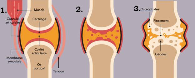 Dans le cas de l’arthrose, le cartilage va perdre de l’eau et donc de l’élasticité, il va devenir cassant et va moins amortir les chocs. C’est à ce moment-là que des douleurs peuvent apparaître. Cette pression va créer des contraintes de compression neuronale ou des artères et veines dans l’articulation ce qui peut créer des inflammations. Ou la pression continue de l’articulation peut également créer des excroissances osseuses qui, auquel des cas peuvent venir se frotter aux structures musculaires et ligamentaires, et ce, fortement continue peut également provoquer une inflammation et donc des douleurs. Toutes cette compression peut également avoir un impact sur le mouvement de l’articulation elle-même.